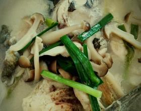 刚下锅煎鱼的时候多煎一会,避免鱼肉还没紧致导致粘锅。调料只需要放一点盐,料酒去腥。因为蘑菇,姜片,鱼,大蒜苗,炖汤有食材自身的鲜美