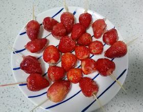 草莓最好用牙签插到泡沫纸盒上 我手边没有 只能放盘子里的 这样就比较容易黏
