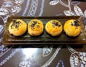 - 4. 出炉后,将咸蛋黄和豆沙搓成圆球形状备用。