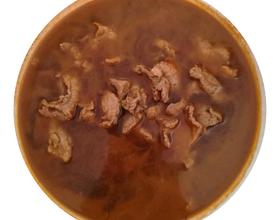 另起一锅加热至七分熟,加入豆瓣酱翻炒,豆瓣酱出味后加入肉片翻炒,肉片变色后放入蔬菜汤,煮两分钟,连汤带肉一起倒入放了蔬菜的碗中。