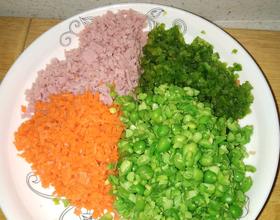 将适量面粉倒入碗中,加入鸡蛋一个,加入切好的主料丁,少于青葱,盐,鸡精,加水,搅匀