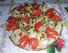 - 3. 再将小番茄雕刻成如图的形状,再将葱花,生抽,醋,油,盐,鸡精,胡椒粉,海鲜酱,黄豆酱,白糖,剁椒装碗里调成汁,等蒸熟后淋在菜品上,最后用型似蟹爪的小番茄装饰一下即可。