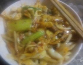 - 14. 倒入煮熟的面段,翻炒出锅,盛入碗里,西瓜吃辣吃蒜的人可以放入适量的油泼辣子大蒜