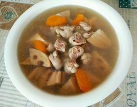炖好的小肠莲藕汤只要放入少许的盐就可以食用了。(小肠可以用到切下在放回汤里)吃着方便些。