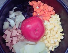 米饭洗干净后再放水然后把所有材料切好放在电饭锅里开始煮