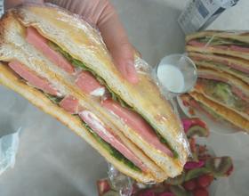 - 5. 煎好的吐司片垫底,抹上一层甜沙拉酱,放一层火腿片,一大片合适的生菜挤上点千岛酱,在覆盖上一片土司,三明治就做好啦!