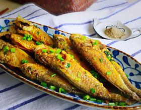 黄花鱼洗尽,不要用盐腌制。鱼入锅后先不要翻动,这是把鱼煎好的关键一步,椒盐直接洒在鱼身上可以更好入味,。香葱的香味会被鱼吸收,特别美味。