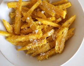 装盘,撒上白糖,超好吃的地瓜条制作完成了。
