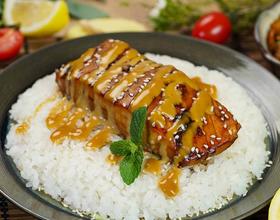 - 5. 将烤好的三文鱼盖在米饭上,撒上熟白芝麻,淋上酱料