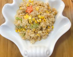 先把玉米粒炒下再放入鸡蛋炒熟再倒入拌匀的干饭,炒的7成熟时倒入酱油调味均匀,即可出锅