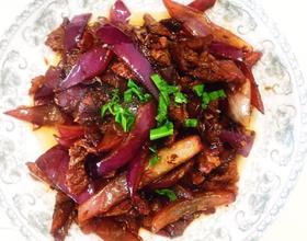 放葱姜牛肉炒熟、放入圆葱,盐、蚝油,翻炒