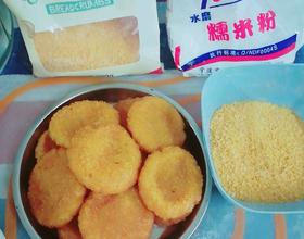 揉成自己喜欢大小的饼状,裹上面包糠,放小火炸,切记小火噢,炸成金黄色就可以了