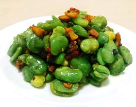 再放少许水,这样蚕豆就酥软,翻炒两分钟