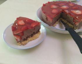 - 6. 隔水融化吉利丁片(提前冷水泡十分钟)倒入之前的酸奶糊中,搅拌均匀,边缘摆上草莓,放入冰箱冷冻两小时