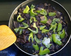放入尖椒继续翻炒,炒的要稍微干一点,再放入适量的盐,最后出锅时撒点鸡精,再撒点香菜。