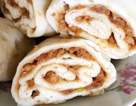 面团醒发好 擀成薄厚适中的面饼 均匀抹上馅料