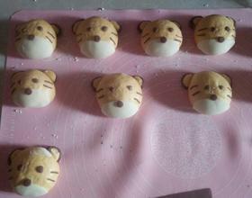 - 6. 黄色面团分割成小面团,用粽色面团围一圈压紧实,对半切开做耳朵