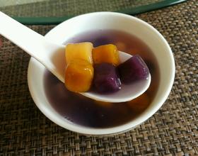 锅里加清水,开了之后再放下去煮,不时搅拌一下以防下沉粘锅,糖度根据个人口味添加,然后等芋圆都浮上来以后颜色慢慢变透亮就可以关火了。