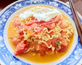 煮一枚荷包蛋备用,起锅烧油放西红柿煸出红油加水煮开