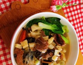 牛肉汤这事也炖好了,锅中盛汤,放切碎的饼、木耳、黄花菜、粉丝煮一会儿。