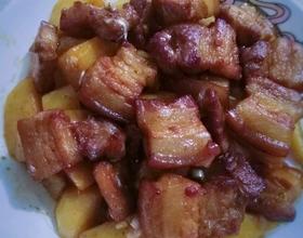 - 4. 然后放入去水后的五花肉爆炒,炒至肉两面呈金黄色的时候放入土豆块一起翻炒下