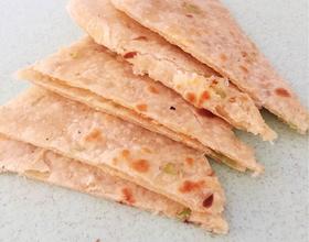 - 1. 用温水调成淡盐水,分次加入面粉,先抓成棉絮状,然后和成光滑面团。覆上保鲜膜放冰箱冷藏室里十分钟。取出取适量面团揪成剂子。擀面杖擀成薄饼。刷油,撒上葱花、椒盐和白芝麻(熟)。