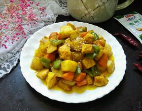 - 12. 装盘撒上白芝麻拍上成品图,美味的咖喱鸡丁就完成了