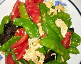 放入荷兰豆,黑木耳,西红柿,加盐.白糖一起炒