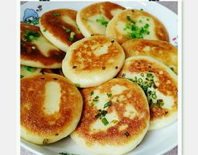 饼中间放点葱花,翻面。煎至两面金黄就出锅了。