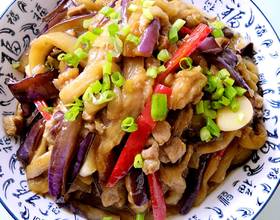 油七分热下入肉丁翻炒断生,下入葱姜蒜翻炒,再依次放入过好油的茄子条和青红椒,倒入调好的汁,翻炒收汁即可。