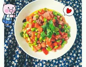- 6. 盛出装盘,撒上香菜,成品图再来一张,一道色香味俱全,下饭的毛豆炒火腿就做好了。