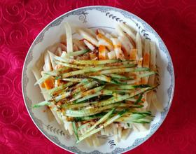 - 8. 撒上一层黄瓜丝,再加上少量辣椒油,再把刚刚调好的料汁放进来
