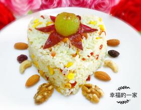 爱心碗盛饭,圆盘放上面,再把圆盘翻下面去,拿掉爱心碗,摆些坚果,再来一颗情有独钟的葡萄,超级爱