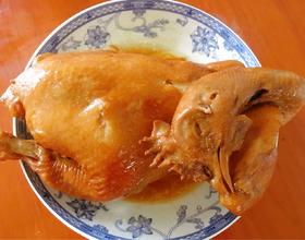 - 6. 锅放底油,小火爆香八角、花椒、葱、姜,转大火加入生抽、料酒、白糖,滚开后加入老汤(没有老汤可以用高汤+炖鸡料包代替),烧开后调好味道,咸淡适中就好。锅胆内放入整鸡,浇上卤汤。按无压键烧半个小时,后打开锅盖翻面,再按煮饭键半小时后关闭电源,锅内焖1-2小时。