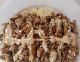 在茄子上撒上炒香的肉末,抹上花生酱就可以享用了。看起来是不是很有食欲呀!