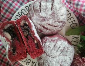 - 10. 擀平,当上芋头陷,紫米陷,再放点葡萄干。