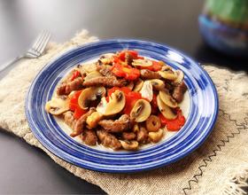 翻炒牛排的速度要快,变色立即倒入蘑菇翻炒!
