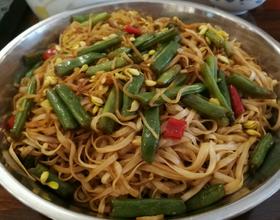 倒入准备好的豆角,绿豆芽,加入适量老抽,盐,翻炒出水。