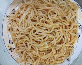 盛出的面条,浇上做好的葱油,芝麻油,陈醋,辣椒油,搅拌匀,可以吃了