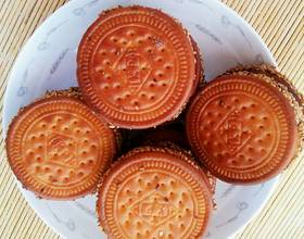 把南瓜泥揉成球,放入饼干中间,再贴合另一面的饼干,轻轻按压,一圈再沾满芝麻。