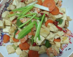 - 5. 倒入切好的豆腐块,洒少许盐,翻炒至两面焦黄。