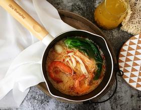 大人食用的可以加辣椒酱、醋等调料,做成酸辣口的时蔬鲜虾米线。