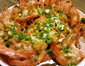 起油锅,把蒜放入油锅中炒炒,直至香味出来,加入50ml的生抽,少许盐,水,煮开,浇在虾上即可。