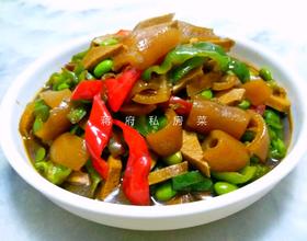 - 7. 锅烧热放适量的油放葱姜蒜煸香,加入肉皮豆干毛豆米煸炒过的青红椒及生抽老抽酱油盐调味盖盖烧一两分钟撒点胡椒粉装盘。