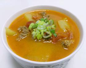 - 4. 熬好加入少量鸡精(也可以不加)盛出,撒上葱花,一碗色香味俱全的番茄土豆牛腩汤就做好了