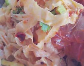 熟豆皮用热水烫1分钟,反复洗几次(豆皮本身就含有盐分,多洗几次,洗去本身的咸味)。再加入适量的辣椒油、糖,黄瓜丝和香菜段,拌一拌。