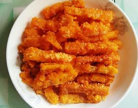 锅中放油,油温5成热下裹好面包糠的南瓜条,开小火慢炸。