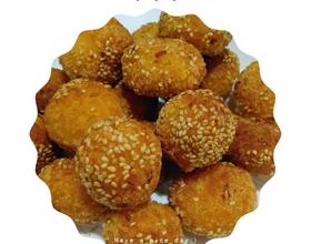 和好的面,用手捏成团,裹上面包糠和芝麻