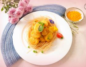 - 6. 钛美钛锅内烧热油,将裹好淀粉的虾仁和日本豆腐放入锅中炸至表面金黄结壳,炸好后捞出,稍等片刻后再复炸一遍;