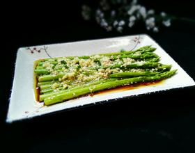 淋上生抽、味极鲜再将蒜米均匀淋浇芦笋上。